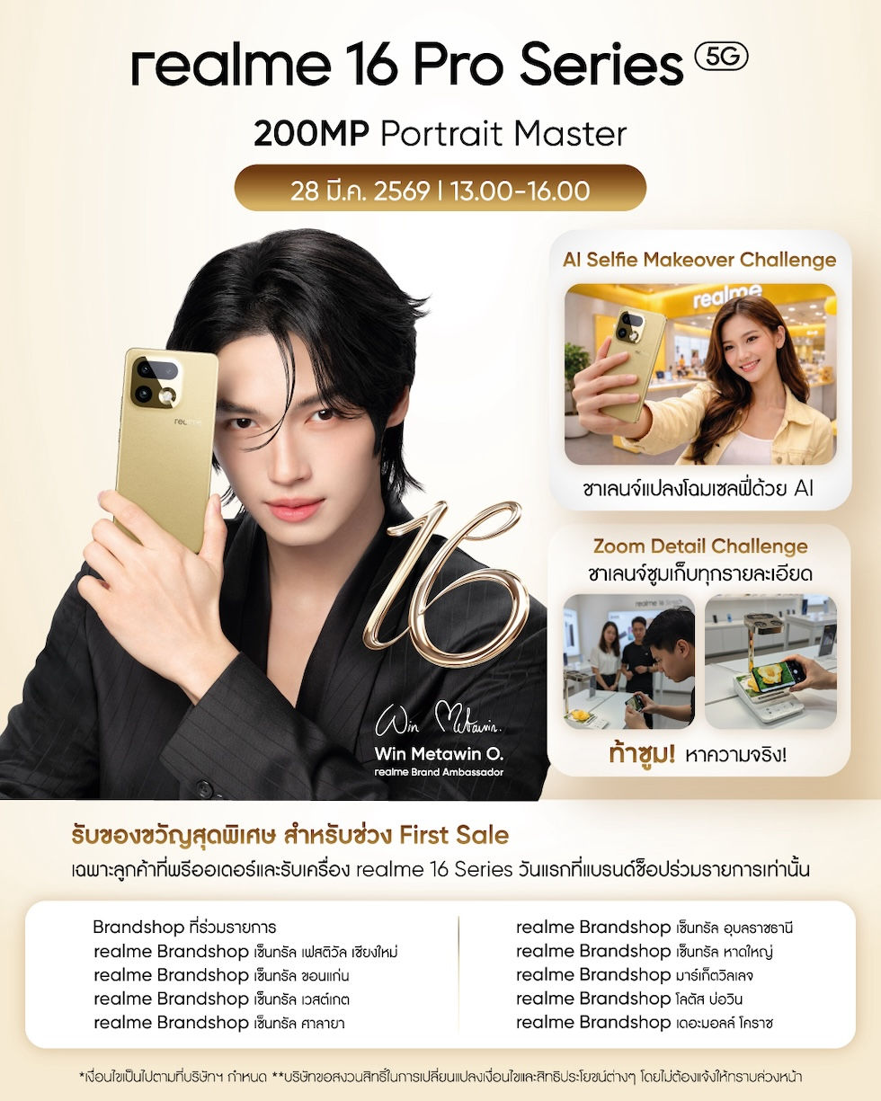 กรุงเทพฯ 31 มีนาคม 2569 – สิ้นสุดการรอคอย! หลังจัดงานเปิดตัวอย่างยิ่งใหญ่พร้อมเซอร์ไพรส์สุดฟิน! กับการประกาศตัวแบรนด์แอมบาสเดอร์หนุ่มหล่อสุดปังอย่าง “วิน-เมธวิน โอภาสเอี่ยมขจร”จนแฟน ๆ ต่างส่งเสียงเชียร์กันสนั่นโซเชียล ในที่สุดก็ถึงเวลาที่ทุกคนรอคอย! เมื่อ realme ประกาศวางจำหน่าย “realme 16 Series 5G” พร้อมกันทั้ง 3 รุ่นแล้ววันนี้ ผ่าน realme Brand Shop และศูนย์จำหน่ายสมาร์ตโฟนชั้นนำทั่วประเทศ