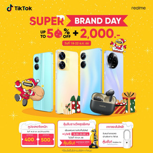 เรียลมี แบรนด์สมาร์ตโฟนที่เติบโตเร็วที่สุดในโลก จัดโปรโมชั่นส่งท้ายปีSuper Brand Day ผ่านช่องทาง Tiktok realme officialมอบส่วนลด 50% โดยแฟน ๆสามารถติดตามทั้งผ่านไลฟ์สดตลอดทั้งวันและนอกจากนี้ยังพบกับสินค้า Flash sale ราคาสุดพิเศษ พร้อมกับของแถมอีกมากมายตั้งแต่วันที่ 18-22 ธันวาคมเท่านั้น