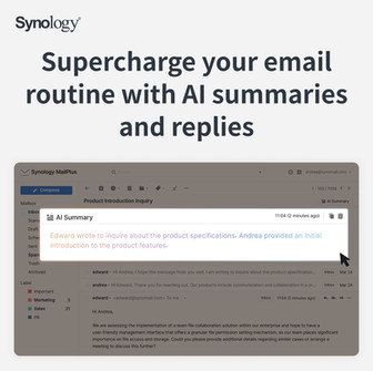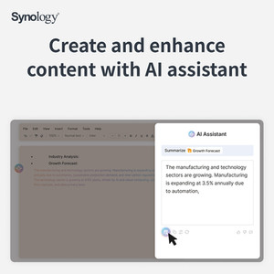 ทั้งนี้ยังช่วยเสริมพลัง Smart Office ด้วย AI บน Private Cloud โดยไม่เสียค่าใช้จ่ายเพิ่มเติม ด้วยการผสานการทำงานกับ Synology Office Suite องค์กรสามารถใช้งาน AI ได้อย่างราบรื่นภายใต้แพลตฟอร์มเดียวกันตัวอย่างฟีเจอร์ เช่น ผู้ช่วย AI ที่ช่วยร่างเนื้อหา ปรับแต่งข้อความ สรุปอีเมล แปลงานนำเสนอ หรือสร้างสูตรในสเปรดชีตได้อัตโนมัติ โดยเชื่อมโยงกับไฟล์ภายใน Synology Drive เพื่อให้ได้ผลลัพธ์ที่มีบริบทและแม่นยำ